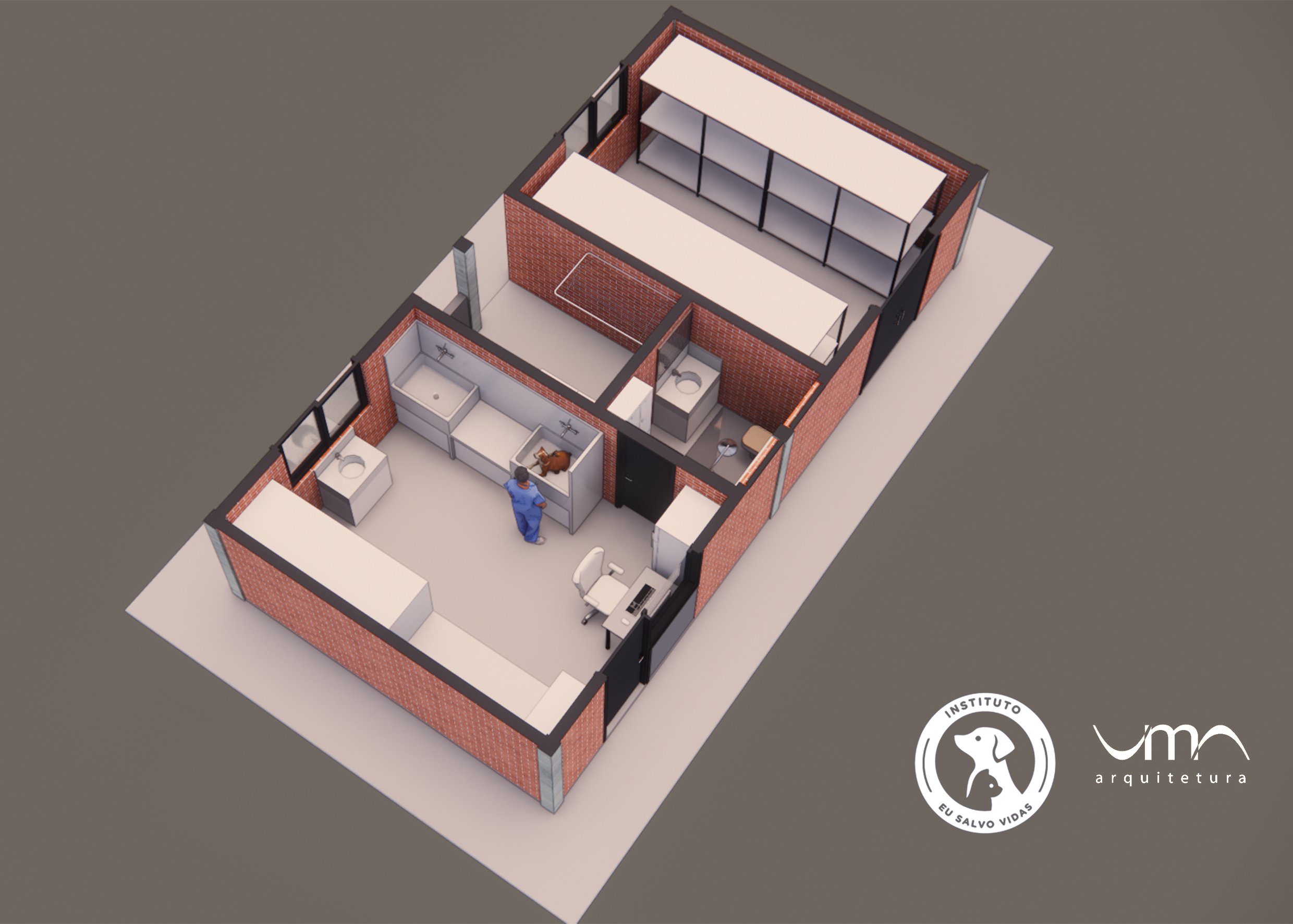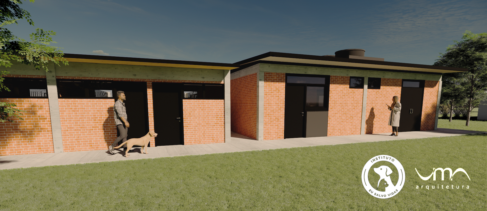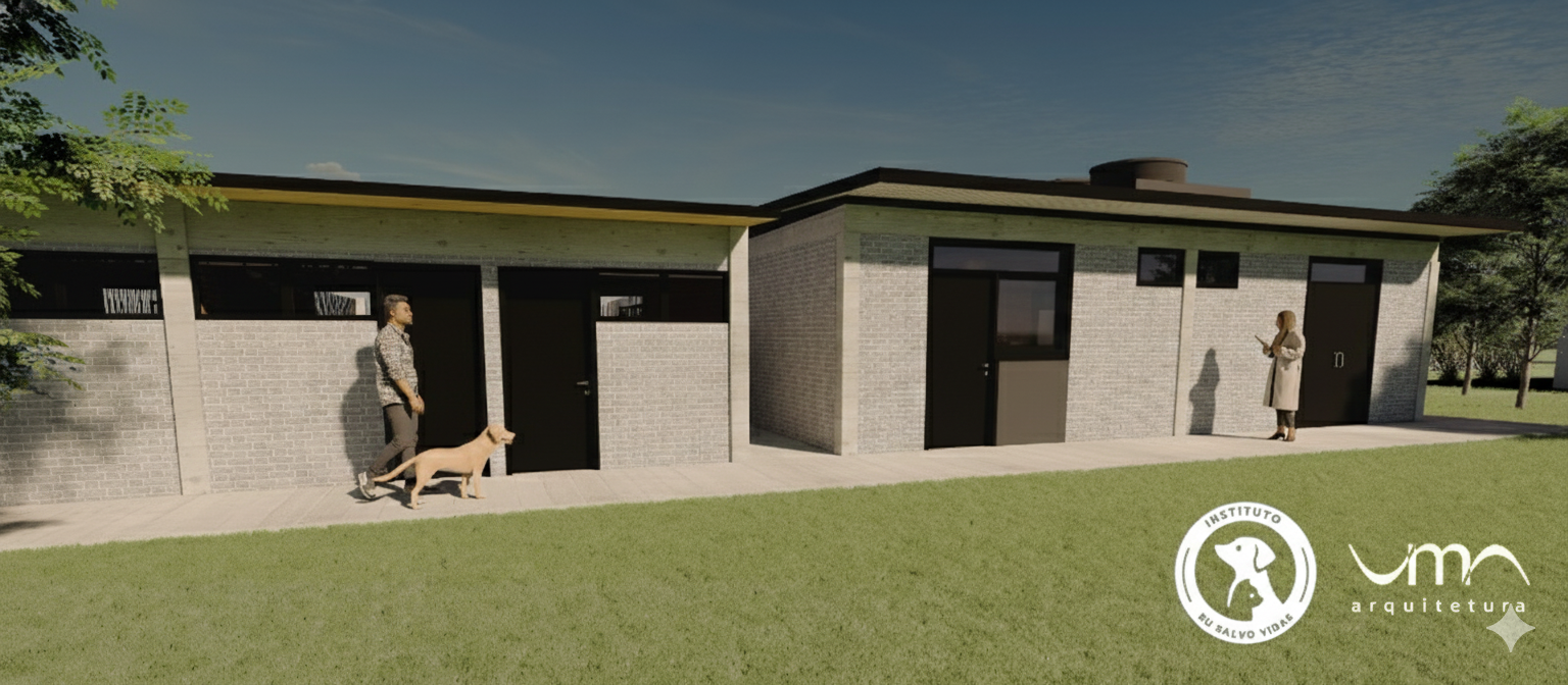 Elaboração de projetos para o novo canil do Instituto Eu Salvo Vidas, com 1 bloco administrativo, 2 blocos para alojamentos coletivos de cães, 1 bloco para alojamento individual de cães, solarios e pátio de soltura. A capacidade do canil é de 110 animais, totalizando 600m² de área construída.